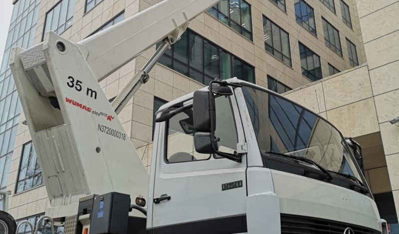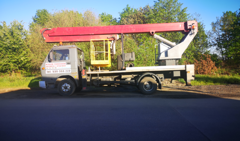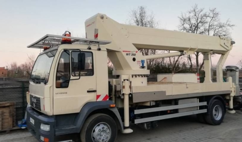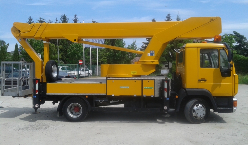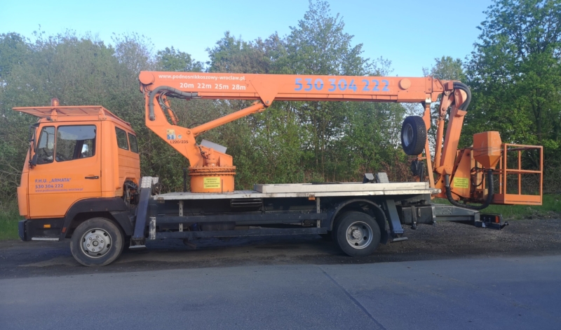 Mercedes Sprinter wysokość robocza 20m, wysieg boczny 8m waga 3,5 t Mercedes 811 Wysokość robocza 22m wysieg boczny 13,5 waga 7,5t Man 8.150, wysokość robocza 25m, wysieg boczny 16m waga 7,5 t Man 8.163, wysokość robocza 30m, wysieg boczny 18m waga 7,5 t Man 18.222 wysokość robocza 35m, wysięg boczny 27m waga 16 t